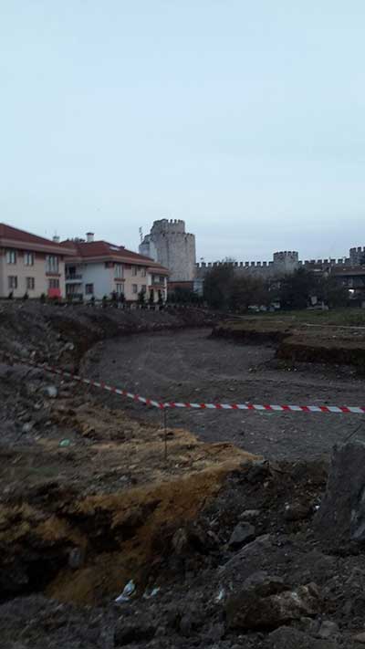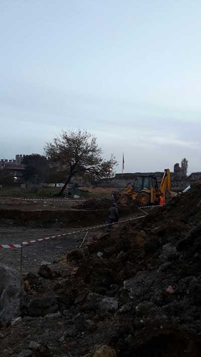 Alan, beton dökümü için hazırlanırken sur dibinde iş makineleriyle yapılan çalışmanın 2863 sayılı Kültür Varlıklarını Koruma Kanunu'na göre Arkeoloji Müzeleri'nin denetiminde yapılması gerekiyor.